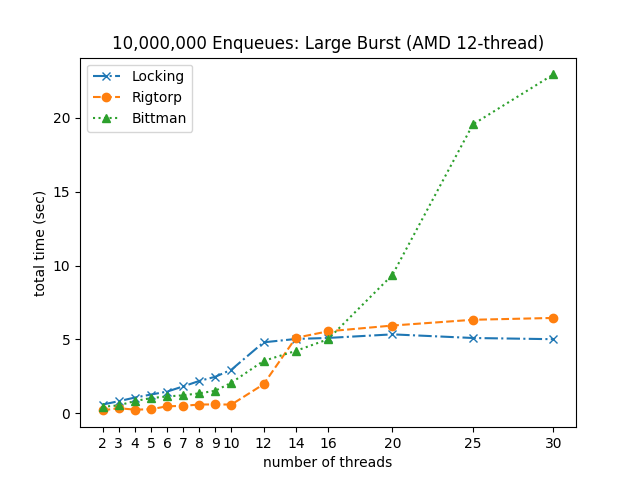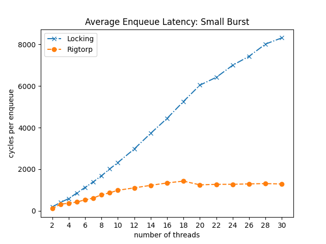 Overall I’m very happy with these results. Rigtorp’s queue completely stomps on the locking queue when there’s a small burst of enqueues. Now let’s also see what happens in a “large burst” scenario.