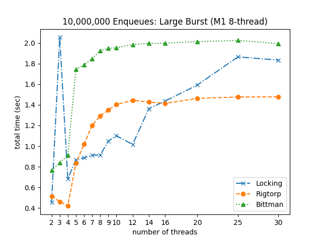 I also care about “large bursts” - when the number of enqueued items exceeds the queue capacity, and the writers need to block while the reader drains the queue. This is not a common case, and it’s entirely preventable in all cases - but it does still happen from time to time, and I don’t want it to be more power hungry or slower than what a locking queue does in that case. I think that the large burst tests also give a measure of how the queue would perform under a sustained workload.