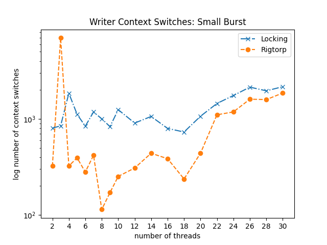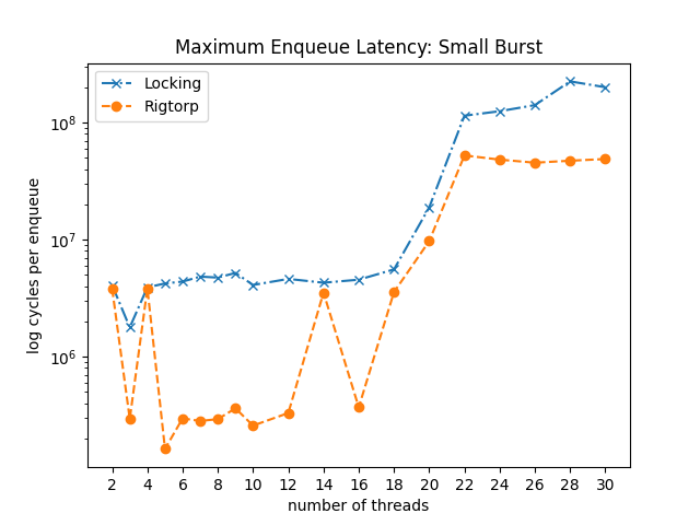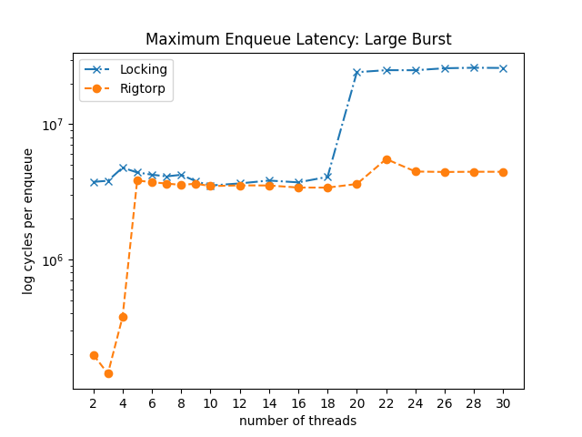 This is the logarithm of the highest measured time in cycles needed to complete an enqueue, over all writer threads. And the Rigtorp queue’s maximum latency is an order of magnitude lower. Note that this is the worst case latency during the entire test of 100,000,000 enqueues. And the worst case for the Rigtorp queue is when the scheduler pre-empts the thread in the middle of an enqueue and then back. That’s 2 context switches. For the locking queue the worst case is when other threads hoard the queue’s lock for a long time.